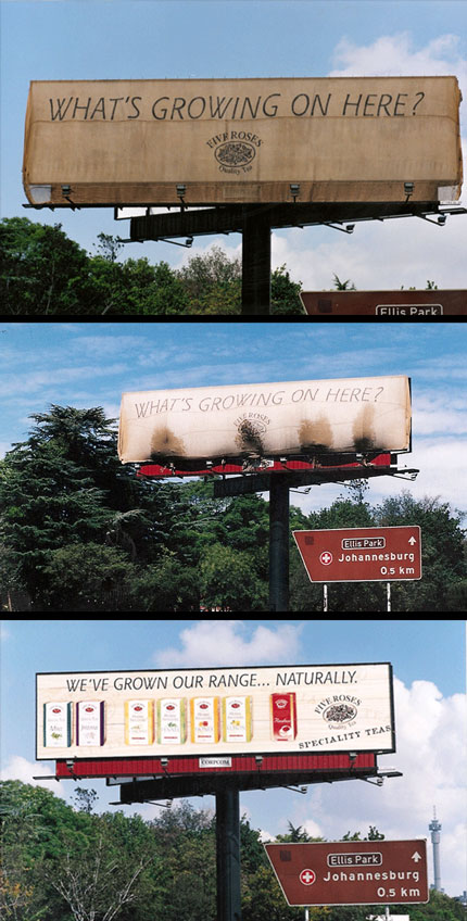 What we did: We covered the outdoor sight with hessian fabric with the message “What’s growing here?” To achieve the growth aspect, we placed trees behind the hessian to give the effect of tea growing and finally everything was removed and the various packaging of 5 Roses Tea was displayed on the billboard.